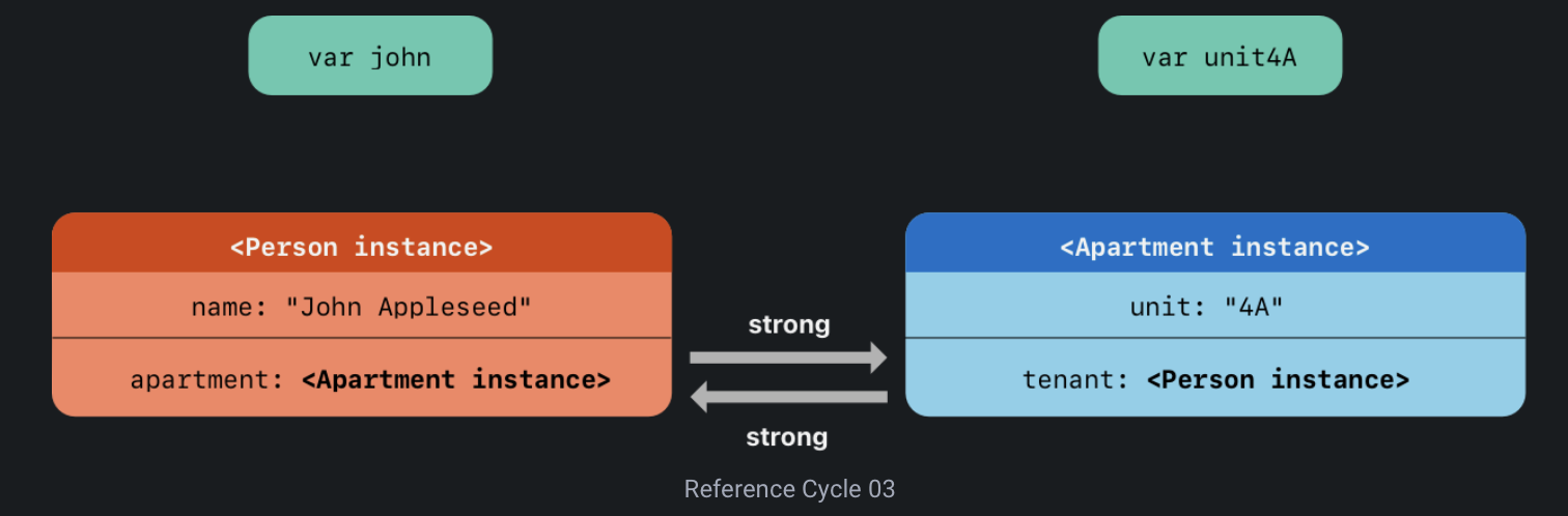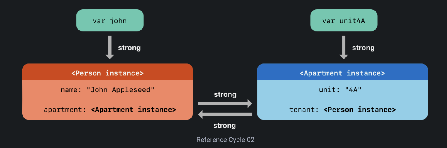 이 현상을 강한 참조 사이클(Strong reference cycle)이라고 함.